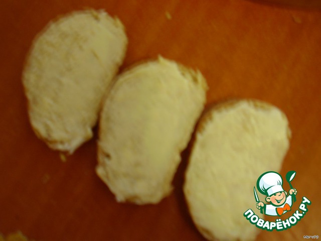 Тонко нарежьте хлеб (батон) небольшими кусочками, смажьте майонезом.