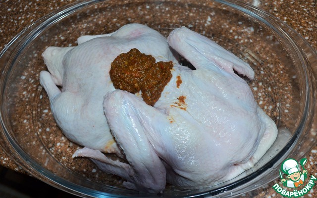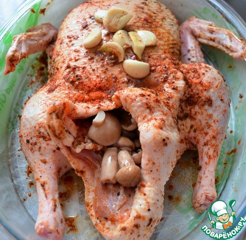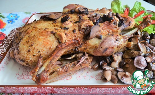 Часть чеснока выложить на утку, внутрь положить 4-5 ст. л. грибов.