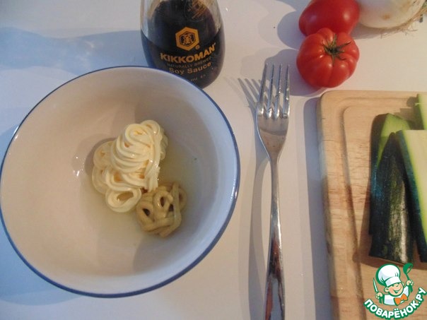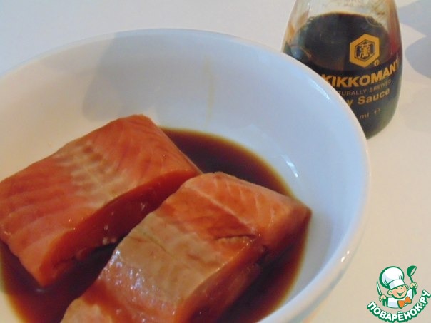 Рыбу замариновать в виски и соевом соусе на 20 минут. У меня два кусочка рыбы по 200 г каждая, можно разрезать каждый кусочек еще пополам, но я не стала делать, так как рыбка слишком нежная и побоялась, что распадется.