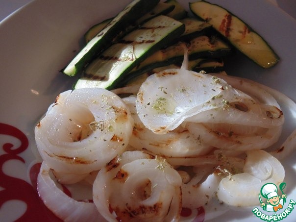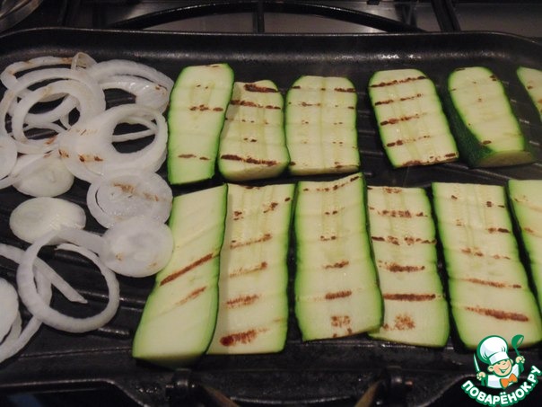 Обжарить лук и кабачки с двух сторон на сковороде-гриль.