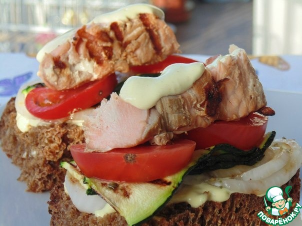 Собрать бутерброд: хлеб смазать 1 ч. л. заправки, затем лук, кабачки, помидоры и рыбу, посолить и поперчить по вкусу, сверху полить оставшимся соусом. Приятного аппетита!!