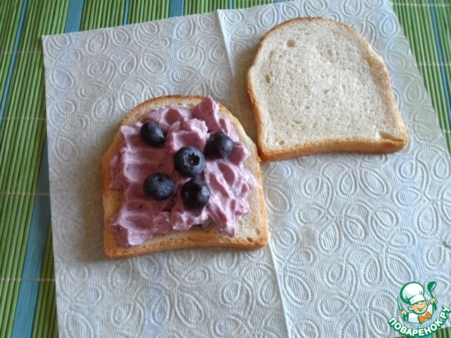 Смешать мягкий сливочный сыр и джем, выложить получившуюся массу на один кусок хлеба. Сверху положить несколько ягод голубики. Накрыть вторым кусочком хлеба.