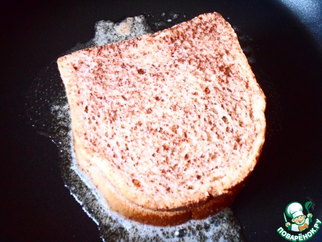 Обмакнуть хлеб с двух сторон в яичную смесь и выложить на разогретую сковороду. Обжарить на среднем огне примерно по 3 минуты с каждой стороны.