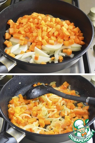В сковороду выложить жир из тушенки, растопить его и на нем спассеровать лук и морковь до готовности.