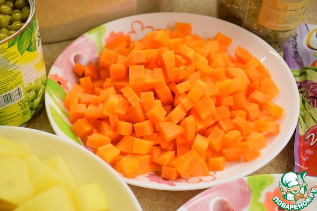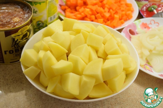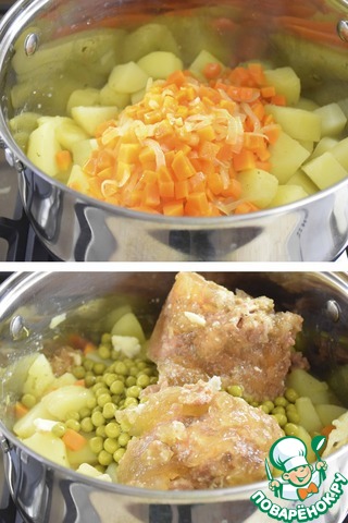 В кастрюлю к картофелю добавить пассерованные овощи, зеленый горошек вместе с жидкостью и тушенку. Хорошо перемешать.