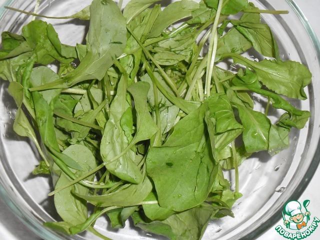Рукколу вымыть, обсушить и положить в миску (при желании можно слегка порвать руками).