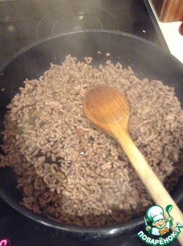Нагреваем растительное масло на сковороде и обжариваем фарш 5 минут на среднем огне, чтобы не было сырого мяса. Стараемся фарш разбивать, чтобы не было комочков. Мешаем, лишняя влага должна испаряться.