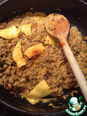 На лепешку выкладываем слой фарша, кладем 1 ломтик плавленного сыра (в идеале конечно лучше расплавить 6 ломтиков сыра и смешать с небольшим количеством красного перца и просто поливать на фарш).
