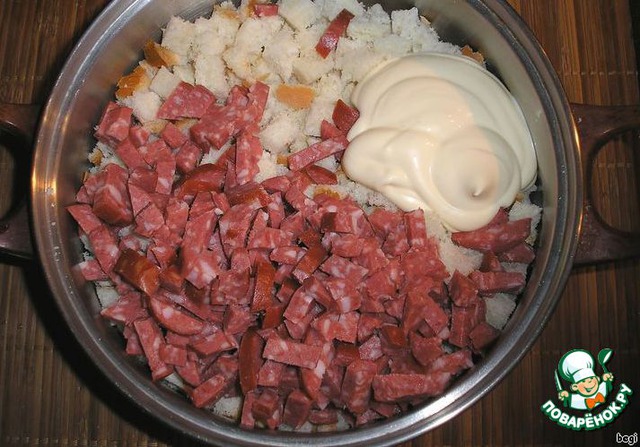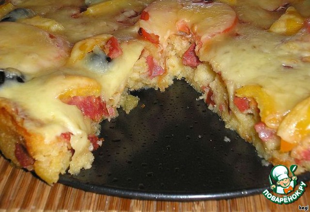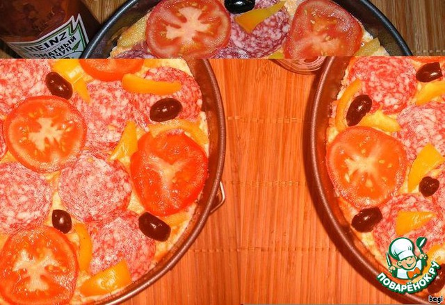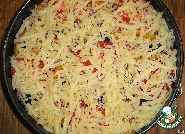 Сверху уложить то, что найдется в холодильнике - грибы, перец, маслины и т.д.