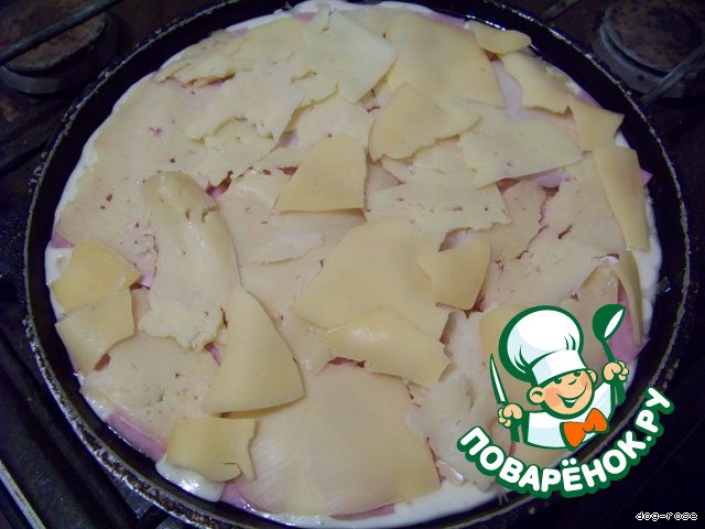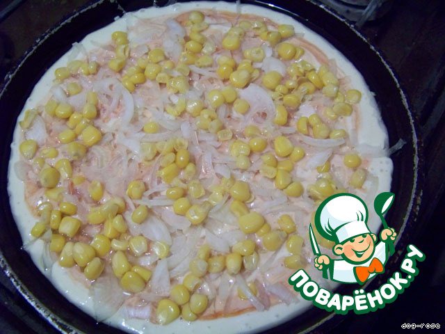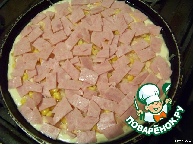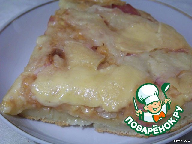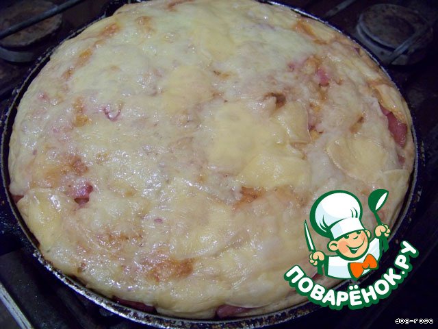 | Очень быстрая и вкусная "пицца". Тесто готовится за две минуты, получается жидким и не раскатывается для основы, как обычно, а выливается в сковородку. Начинка, конечно, может быть любой, по Вашему вкусу. |