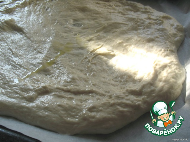 Далее выложить на лист, на котором будете выпекать. Я простелила противень бумагой, которую смазала оливковым маслом кисточкой – так и низ будет поджаристым. Тесто на лист прямо выливается – видите структуру? Покрыть пленкой, смазанной маслом (тесто очень липкое) и оставить на полчаса.