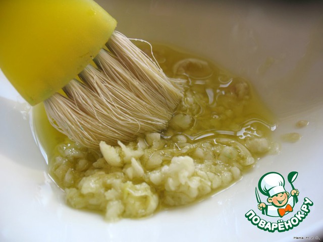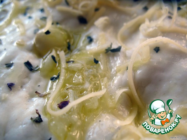 Смазать верх маслом с чесноком кисточкой, посыпать тертым сыром – у меня смесь пармезана и гауды. Посыпать базиликом и морской солью (солью не сыпала – ребенок не есть кусочки морской соли)