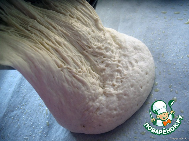 Я замешиваю в хлебопечке. Растворить дрожжи в минералке, дать постоять 10 минут. Просеять муку с солью, добавить сахар и дрожжи с водой и замесить тесто – месить 10 минут. Тесто будет жидкое, но муку не добавлять, чтоб не испортить конечную текстуру.