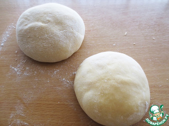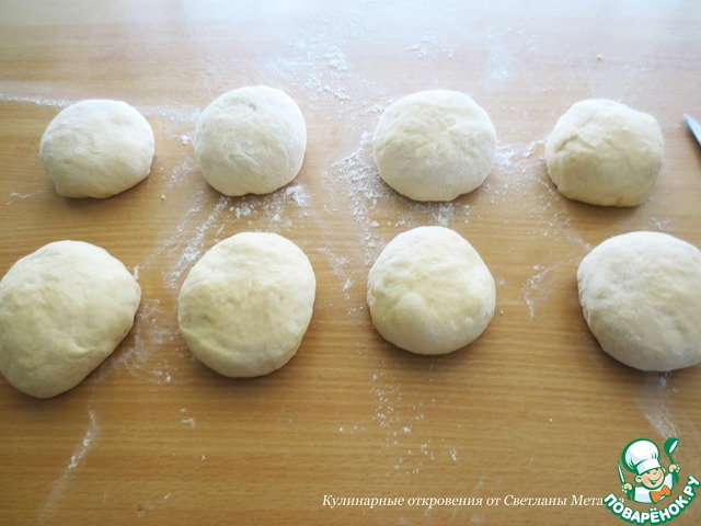 После того как начинка готова, приступаем к работе с тестом. Для этого его нужно еще раз обмять и потом разделить на 8 одинаковых часте