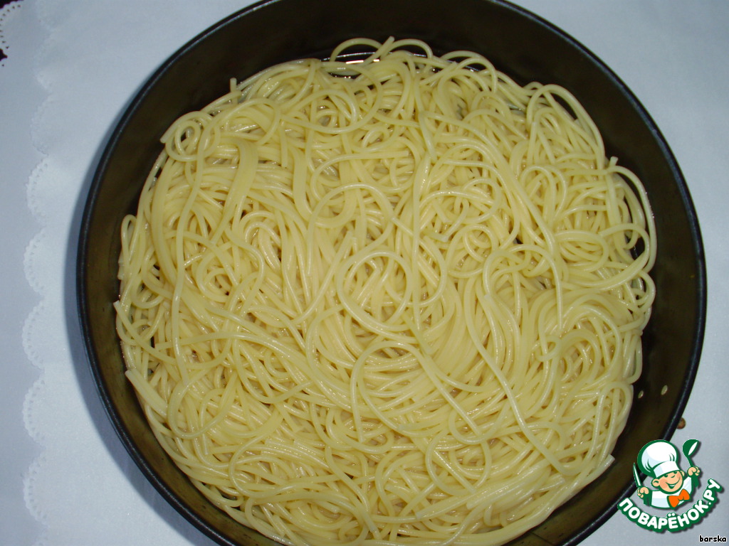 Отварные спагетти выложить в смазанную маслом разъёмную форму