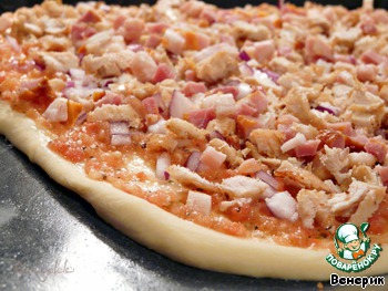 Раскатываем тесто, смазываем соусом, раскидываем по тесту нарезанный красный репчатый лук.