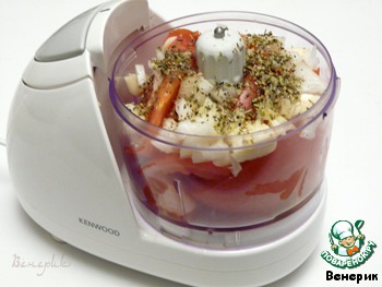 Готовим соус. Кладём в блендер помидор, лук репчатый, базилик, столовую ложку оливкового масла, сахар, всякие ароматические травы (у меня набор итальянских трав), чеснок, соль, черный перец.