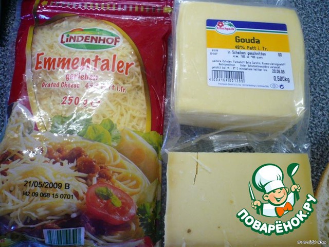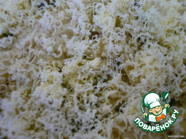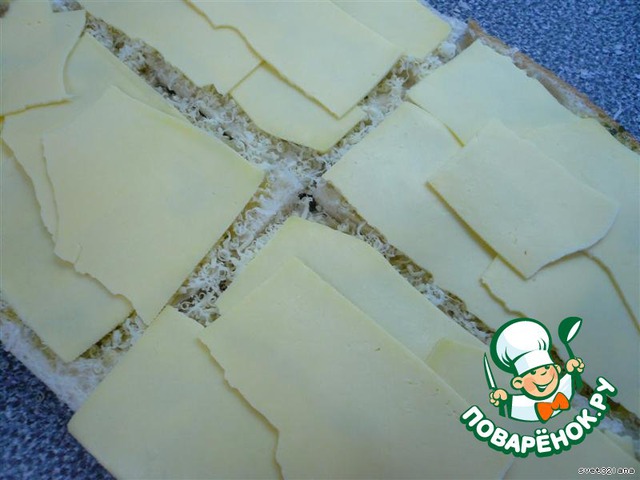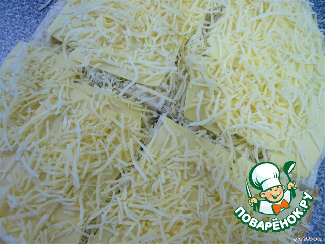 Начинаем слоями укладывать различные сорта сыров. У меня оказалось 3 вида. Можно и одним обойтись. Но желательно много сыра, т.е. толстым слоем, ну, вы меня понимаете, сыра много не бывает.