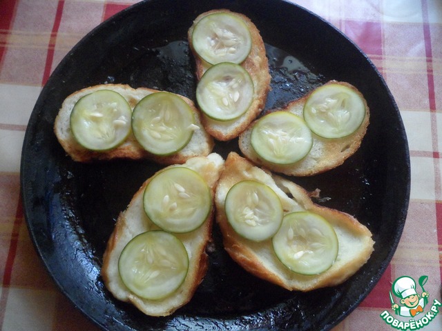 Выложить 5 штук на смазанную маслом сковороду, на них порезанный кружочками огурец. Сковорода у меня старинная, еще от бабули досталась, со съемной ручкой, она на ней блины в печке жарила. Ну это так лирическое отступление.