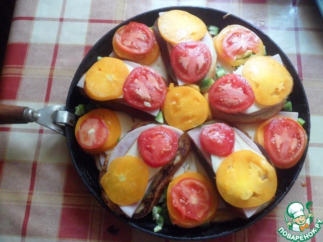 В промежутки между гренками кладем кружочки помидор и присыпаем их мелко порезанным болгарским перцем.