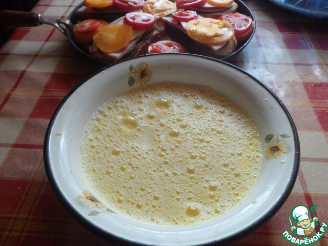 Заливкой поливаем сверху гренки и ставим выпекать на 30 минут при температуре 190 градусов.