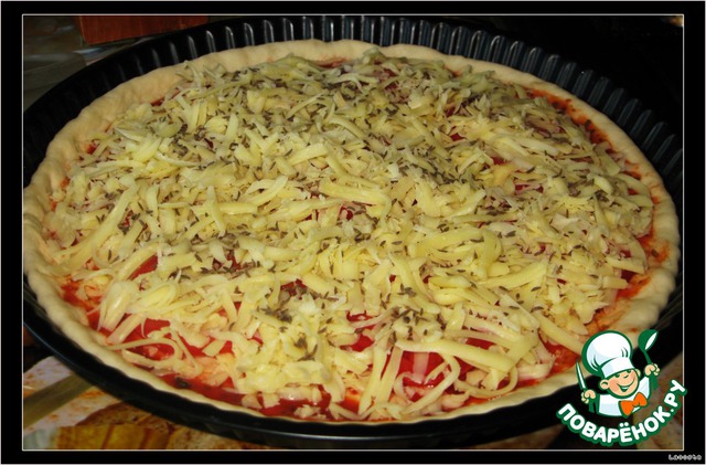 Запекать в разогретом до 200гр духовом шкафу около 25-30 минут (в зависимости от плиты). Готовой пицце дать отдохнуть под тканевой салфеткой 10 минут.