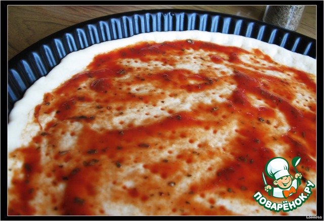 Готовим соус: томат-пасту развести в 130 мл воды, добавить базилик и перемешать, смазать соусом основу для пиццы.