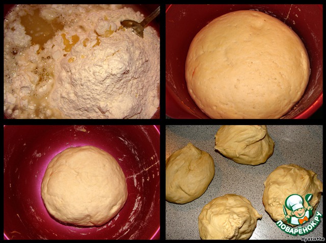 За 40 минут тесто хорошо поднялось, делим его на 4 колобка.