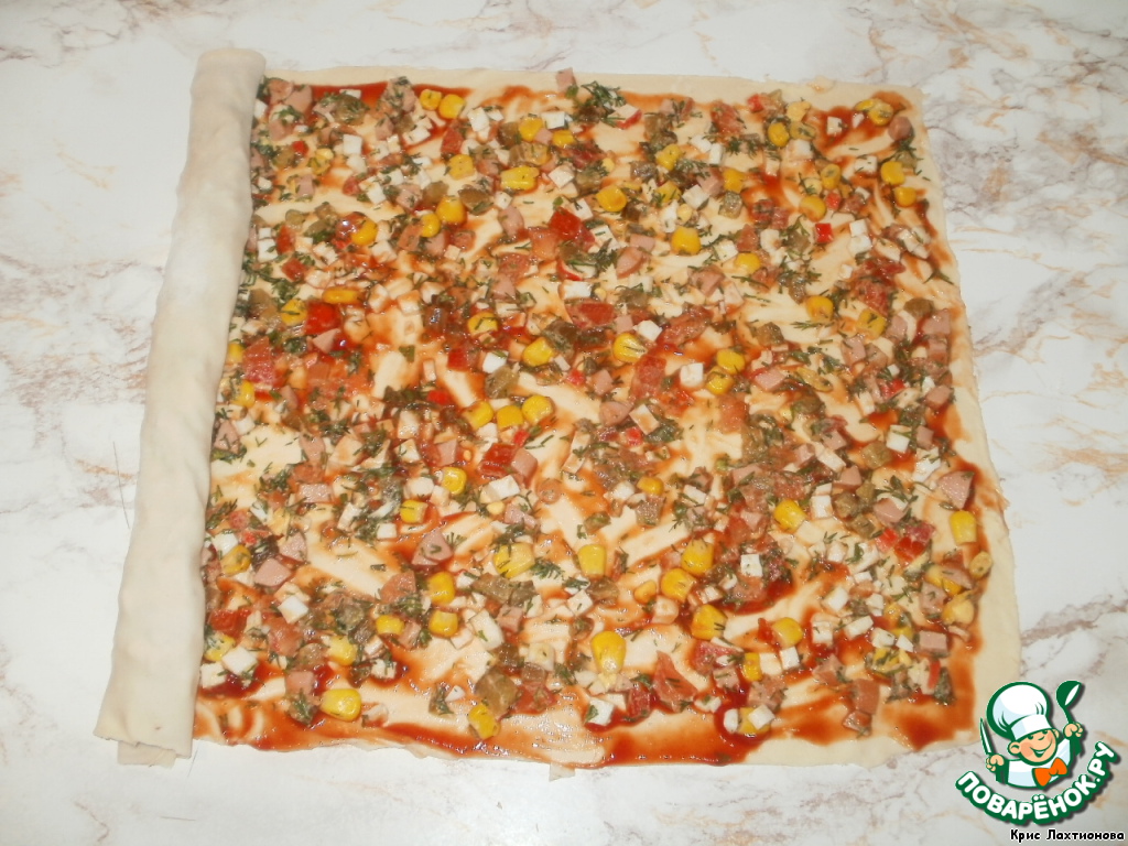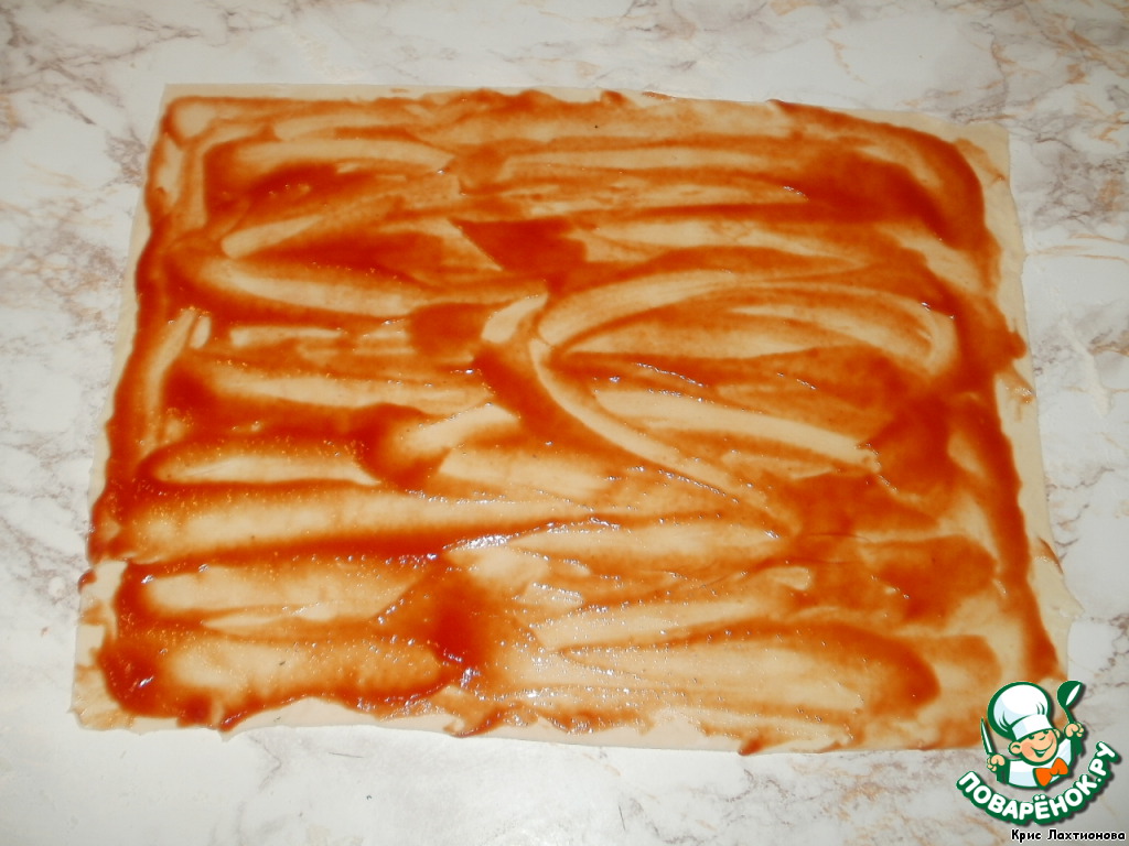 Тесто разделить на 4 части (у меня в упаковке оно уже было разделенное), каждую раскатать очень тонко в прямоугольник. Смазать кетчупом.