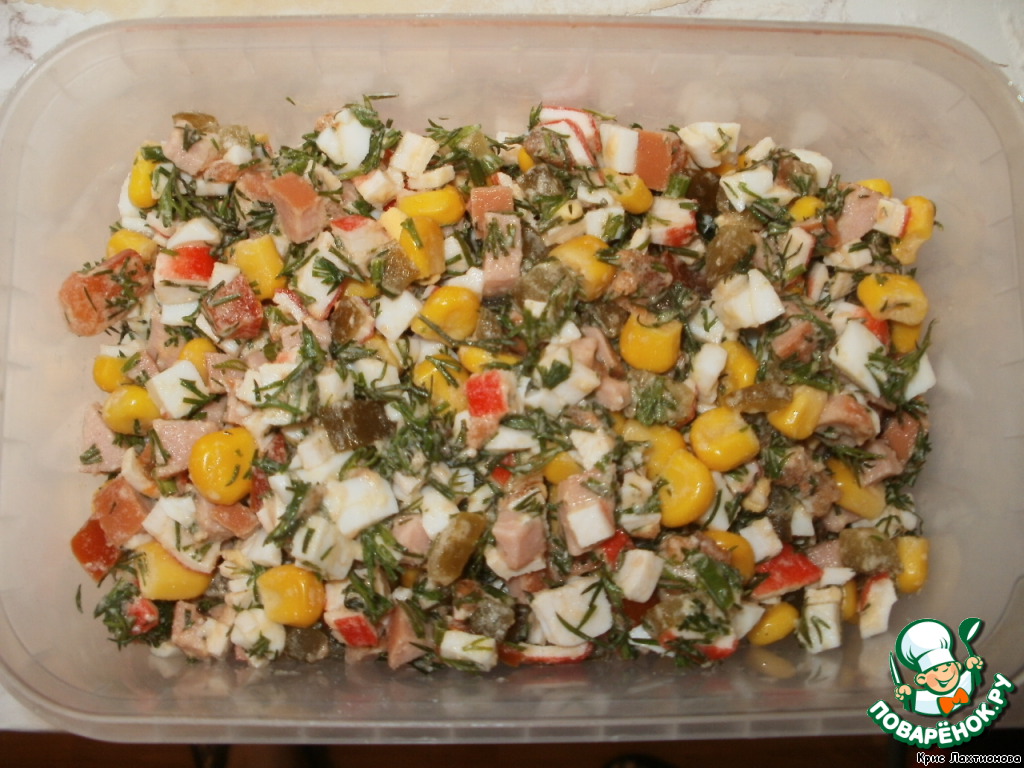 Колбасу (у меня были франкфуртские сосиски), крабовые палочки, яйца, огурцы, помидоры нарезать мелкими кубиками. Добавить кукурузу и мелкоизмельченный укроп. Все хорошо перемешать.