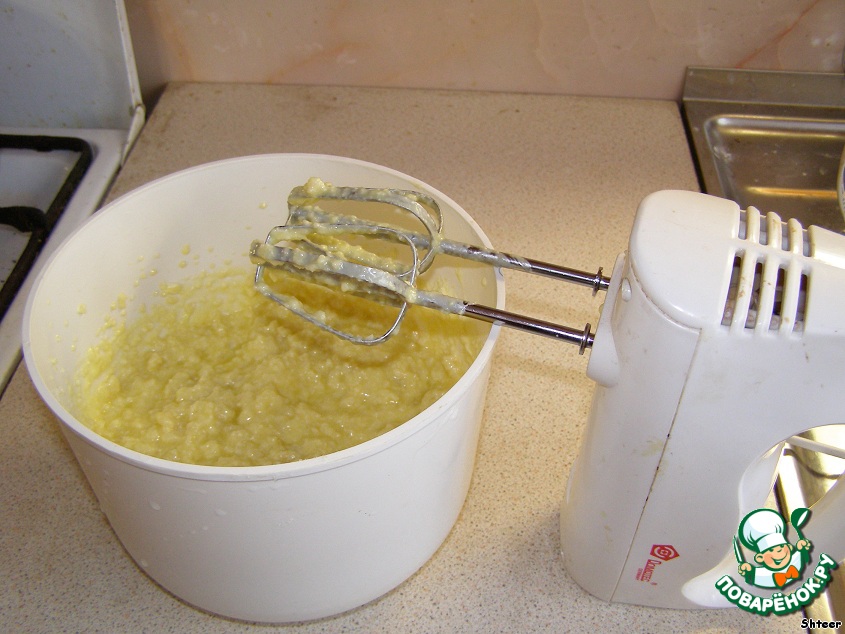 С помощью миксера перемешаем макароны со сливочным маслом комнатной температуры. Добиваемся максимально однородного состояния.