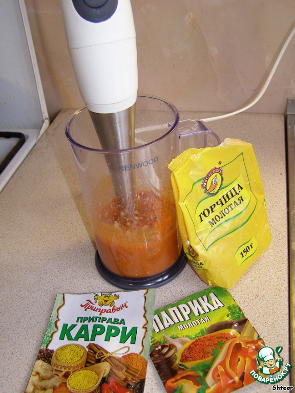 Нам необходимо 3-4 помидора среднего размера. Снимаем с них кожицу, режем небольшими дольками и измельчаем при помощи блендера. Добавляем молотый порошок горчицы, карри, паприку, соль и молотый черный перец. Все хорошо перемешиваем.