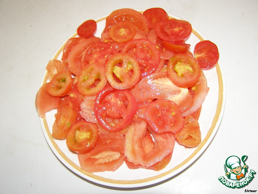 Поверх томатного соуса распределяем нарезанные помидоры, перекладывая тонкими ломтиками мяса. Сверху - тонко нарезанные кусочки брынзы.