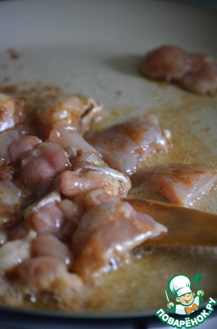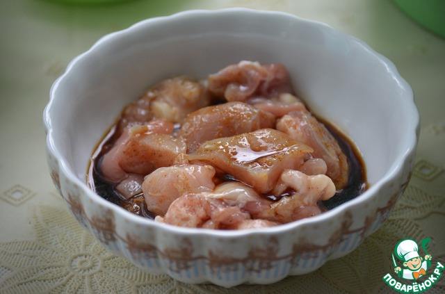 Филе курицы промыть, нарезать на мелкие кусочки, по вкусу добавить специи, замариновать в соевом соусе 30 мин.