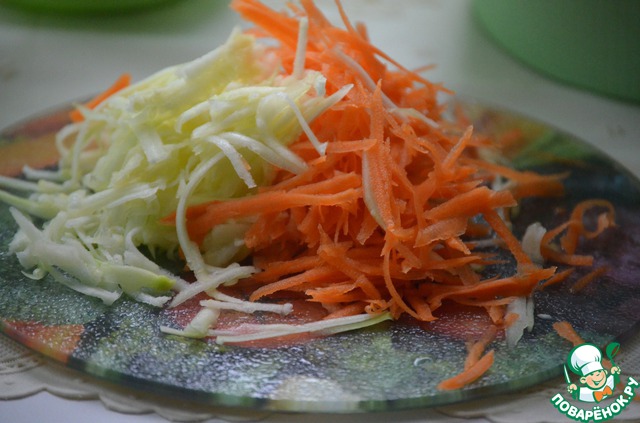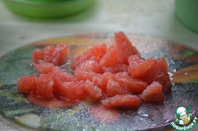 Тесто раскатать в тонкий пласт, выложить на противень, сделать ножом несколько проколов. Сверху уложить филе курицы, на него дольки грейпфрута, посыпать тертыми морковью и кабачком, посолить, поперчить. Сбрызнуть оливковым маслом и выпекать в духовке при 220С 10 мин