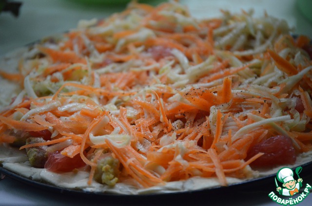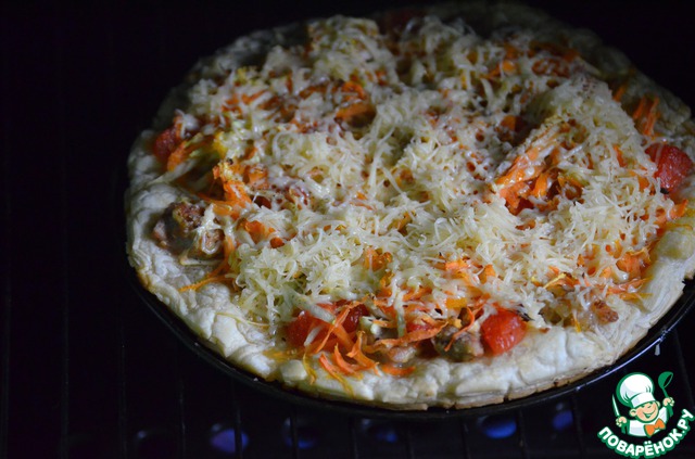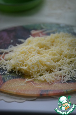 Затем пиццу вынуть, посыпать тертым сыром и выпекать еще 10-15 мин.