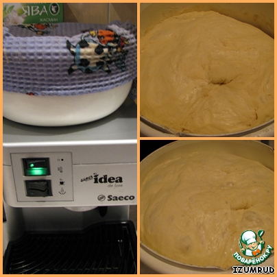 Поставить тесто в тёплое место, накрыв влажным полотенцем (дрожжи любят влагу).