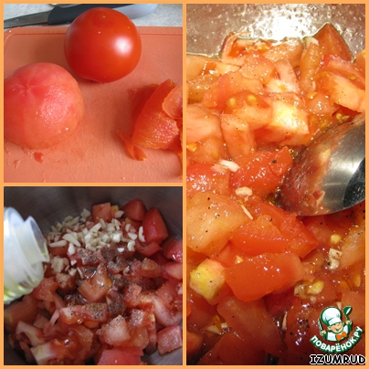 Помидоры ошпарить, очистить от кожуры и нарезать кубиками.