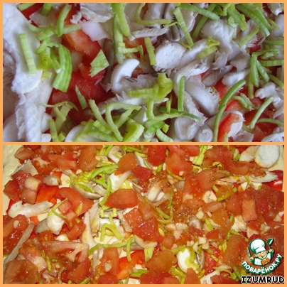 слой тонко нашинкованного болгарского перца, на перец - нашинкованные грибы,