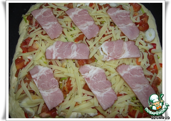 На помидорный слой выкладываем натёртый сыр, на сыр выкладываем кусочки бекона.