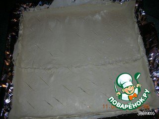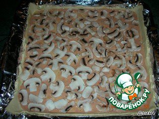 Слоеное тесто растягиваем, выкладываем на противень, смазываем смесью кетчупа и грибного соуса