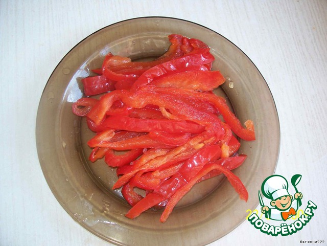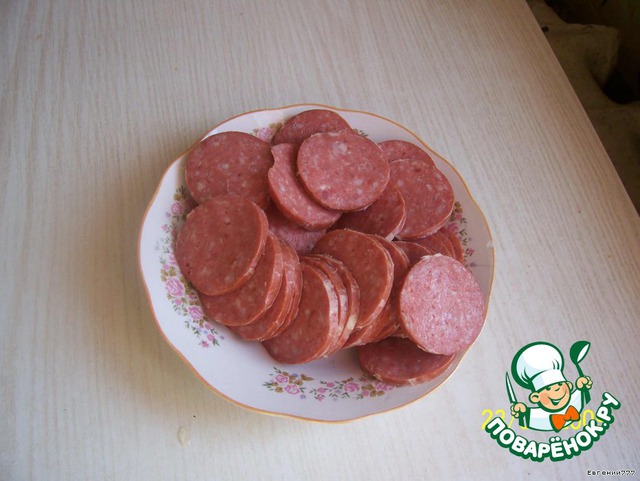 Затем кладём колбаску, украшаем сладким перцем и в духовку.