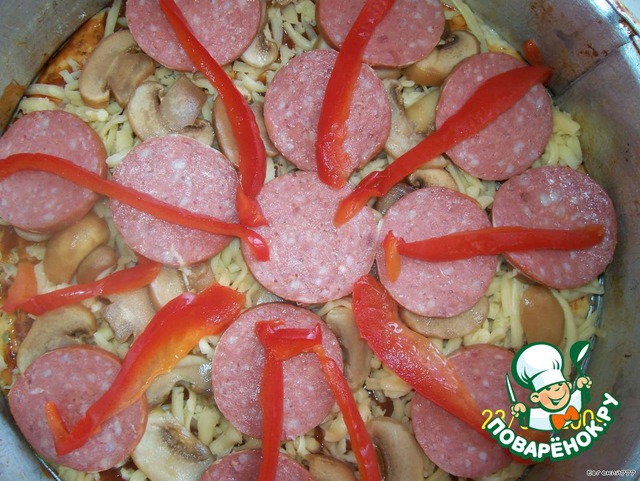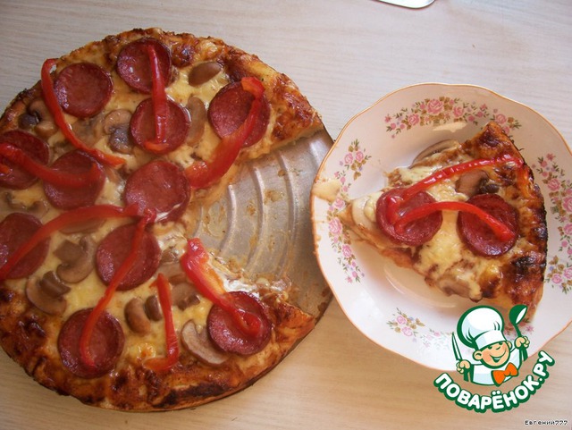 Здравствуйте дорогие поварята, сегодня решил вам поведать рецепт своей фирменной пиццы, хоть их здесь и много... но я все же решил потому, что как мне кажется она самая вкусная, по крайней мере не хуже чем в пиццерии. Так вот сначала заводим пирожковое тесто. Затем режем грибы, колбаску, перец сладкий и трем сыр. Раскладываем тесто на противень, мажем кетчупом(можно посыпать приправой), затем посыпаем тертым сыром, выкладываем колбасу, грибы, украшаем перчиком и в духовку до готовности. Вынимаем, режем, кушаем. Приятного аппетита!P. S Также можно добавить лучек репчатый. Да и вообще с пиццей можно эксперементировать бесконечно ; -) Так что удачи вам в готовке и вообще