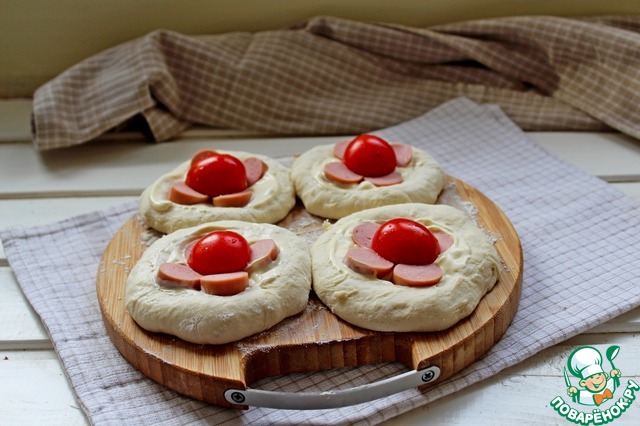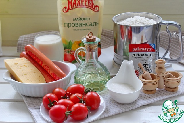 Для приготовления мини пицц нам понадобится следующий набор продуктов:для теста :мука, молоко (или вода ) соль, масло оливковое. Для начинки )сыр, сосиски майонез и помидорки черри.