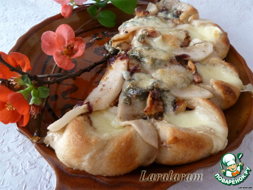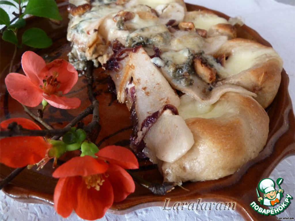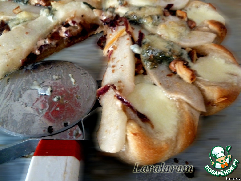 P.S. Тесто очень хорошо пропеклось. Сыр хорошо расплавился, груши были в меру мягкие. Особо бесподобный вкус придаёт лук!