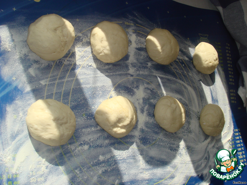Когда тесто поднимется, разделить на 8-10 частей, сформировать в шары, дать постоять 15-20 минут, накрыв полотенцем.