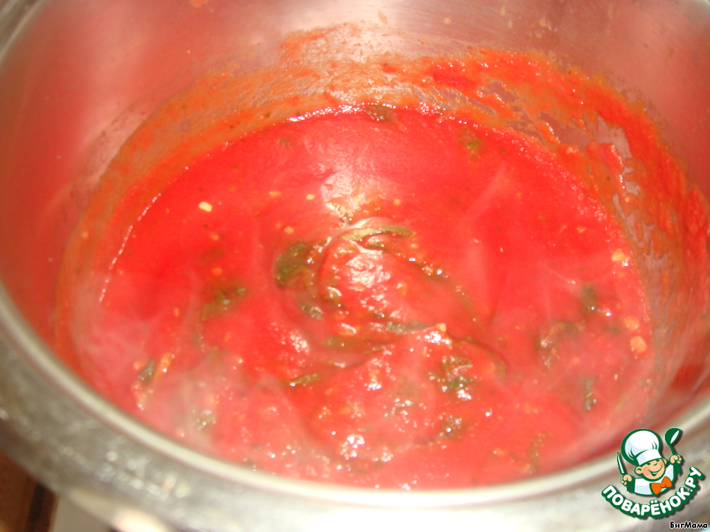 2. Приготовить соус. Смешать в посуде с толстым дном томат, мелко нарубленный базилик, протертый чеснок, соль, перец. Вскипятить и оставить томиться, помешивая, на 30 минут.