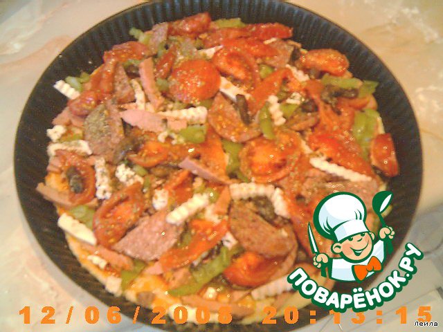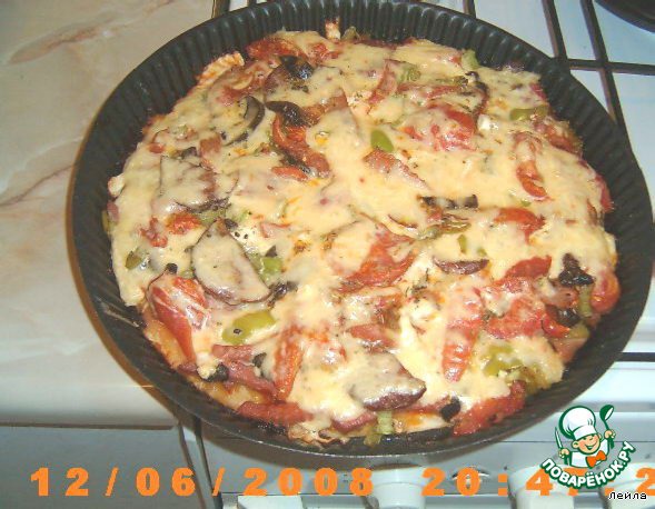 Нагреть духовку до t=200°С. Раскатать тесто по форме. (У меня еще осталось тесто на маленькую пиццу, можно сделать с другой начинкой).