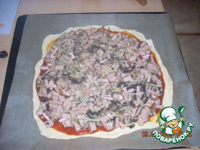 Тесто смазать нашим томатным соусом, оставляя края. Выкладываем начинку поверх соуса, смазываем края водой и накрываем сверху второй половиной теста, так-же расканное в овал. Края прижать и дать полежать 10 мин.