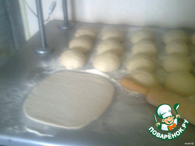 Готовое тесто разделываем на шарики по 150 г, раскладываем их на столе на 10 минут, чтобы поднялись, и раскатываем по форме сковороды, на которой мы будем печь лепешки